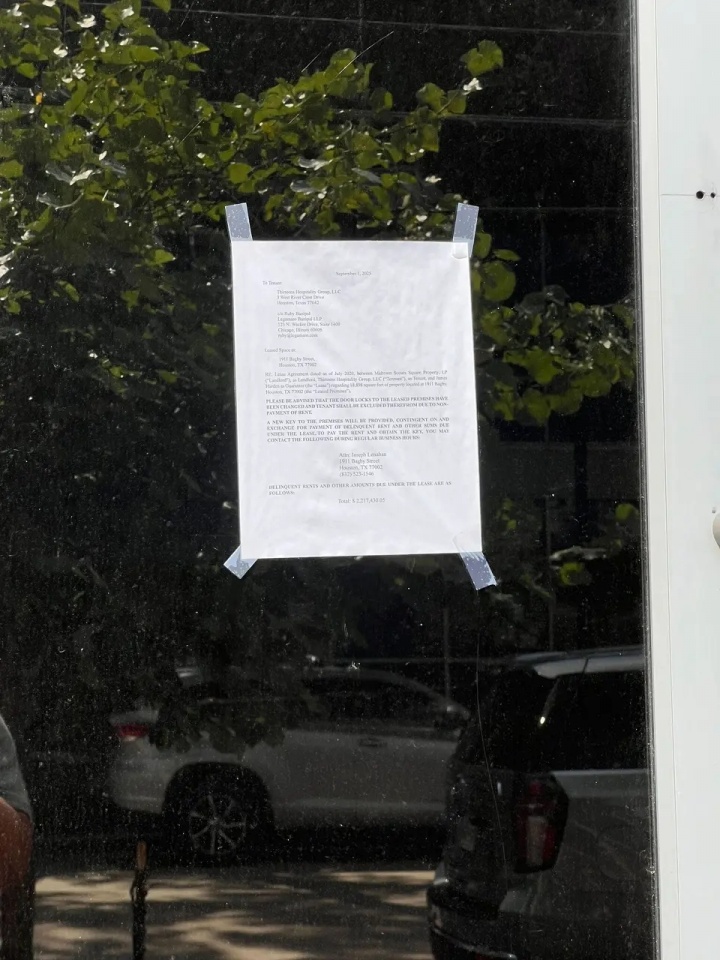 09月04日讯 据《休斯敦纪事报》记者Michael Shapiro报道,快船球星、前火箭核心哈登在休斯敦的餐馆“Thirteen”目前因拖欠220万美元的租金和其他租赁款项而被关闭,餐馆门上贴着一张通知。